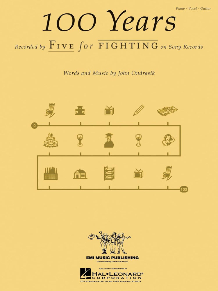 The single sheet music to the song '100 Years' by Five For Fighting arranged for voice with piano and guitar accompaniment.