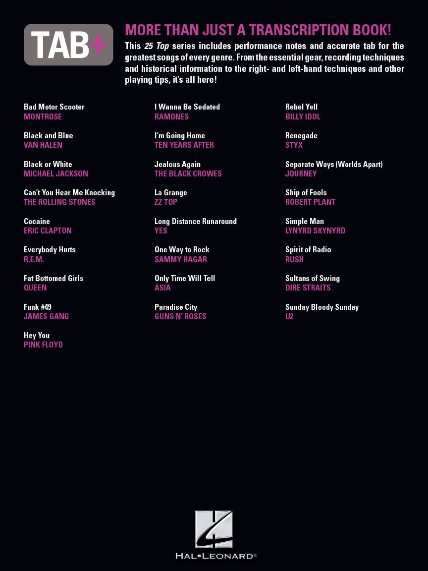 This series includes performance notes and accurate tab for the greatestsongs of every genre. From the essential gear, recording techniques and historical information, to the right- and left-hand techniques and othe r playing tips – it's all here! Master 25 rock tunes, including: Can't You Hear Me Knocking • Cocaine • Fat Bottomed Girls • I Wanna Be Sedated • La Grange • Paradise City •Rebel Yell • Renegade • Simple Man • Sultans of Swing &b ull; and more. 302 pages!