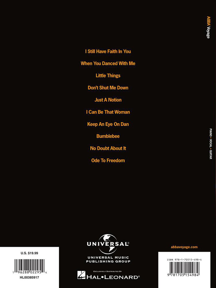 Nearly 40 years since their last album, ABBA is back at the top of the charts with a brand-new album featuring ten tracks. Our matching folio includes each song arranged for piano and voice with guitar chord frames. Songs include: Bumblebee • Don't Shut Me Down • I Can Be That Woman • I Still Have Faith in You • Just a Notion • Keep an Eye on Dan • Little Things • No Doubt About It • Ode to Freedom • When You Danced with Me.