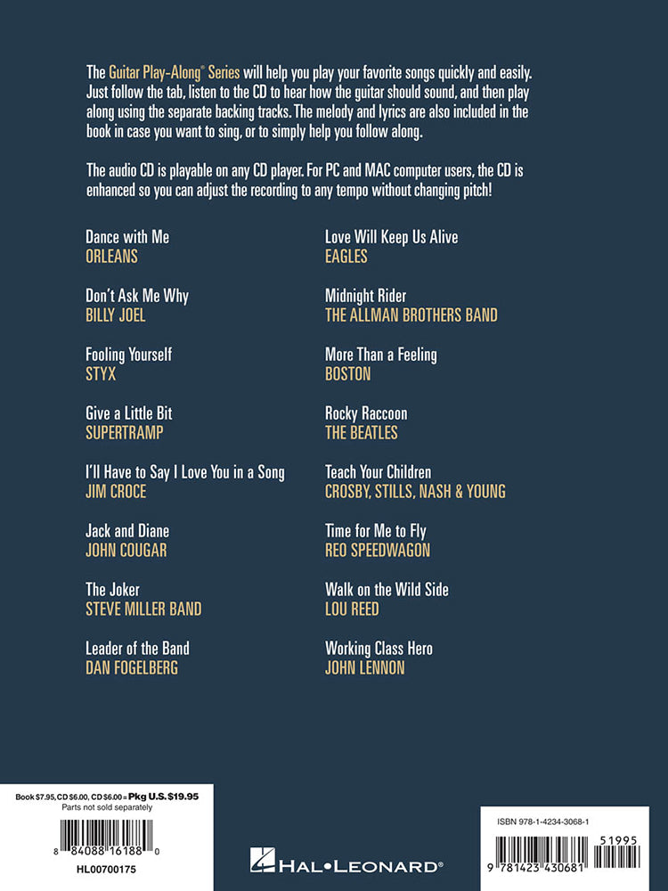 The Guitar Play-Along Series will help you play your favorite songs quickly and easily! Just follow the tab, listen to the CD to hear how the guitar should sound, and then play along using the separate backing tracks. The melody and lyrics are also included in the book in case you want to sing, or to simply help you follow along. The audio CD is playable on any CD player. For PC and Mac computer users, the CD is enhanced so you can adjust the recording to any tempo without changing pitch! A supersized collection of 16 songs: Give a Little Bit · Jack and Diane · The Joker · More Than a Feeling · Rocky Raccoon · Teach Your Children · Time for Me to Fly · Walk on the Wild Side · and more.