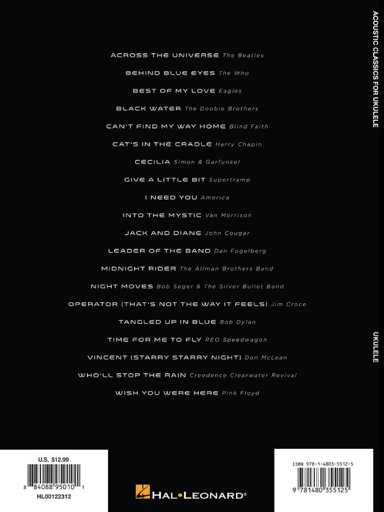 20 classics arranged to sound great on the uke, including: Across the Universe • Best of My Love • Cat's in the Cradle • Cecilia • Into the Mystic • Jack and Diane • Night Moves • Operator (That's Not the Way It Feels) • Tangled up in Blue • Time for Me to Fly • Who'll Stop the Rain • Wish You Were Here • and more.