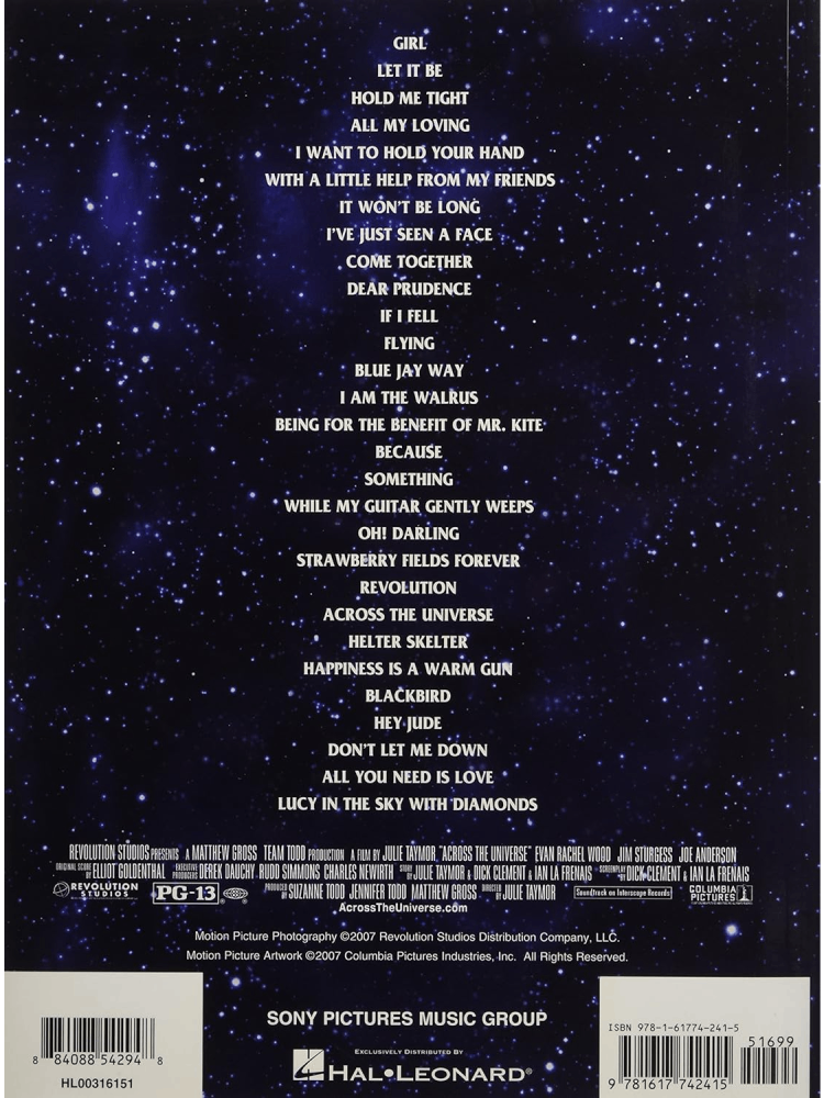 This songbook contains easy piano arrangements of 29 songs from the movie that uses Beatles songs as an amazing backdrop for a beautiful and whimsical love story. Songs include: Across the Universe • All My Loving • All You Need Is Love • Blackbird • Dear Prudence • Helter Skelter • Hey Jude • I've Just Seen a Face • Let It Be • Lucy in the Sky with Diamonds • Revolution • Something • While My Guitar Gently Weeps • and more.