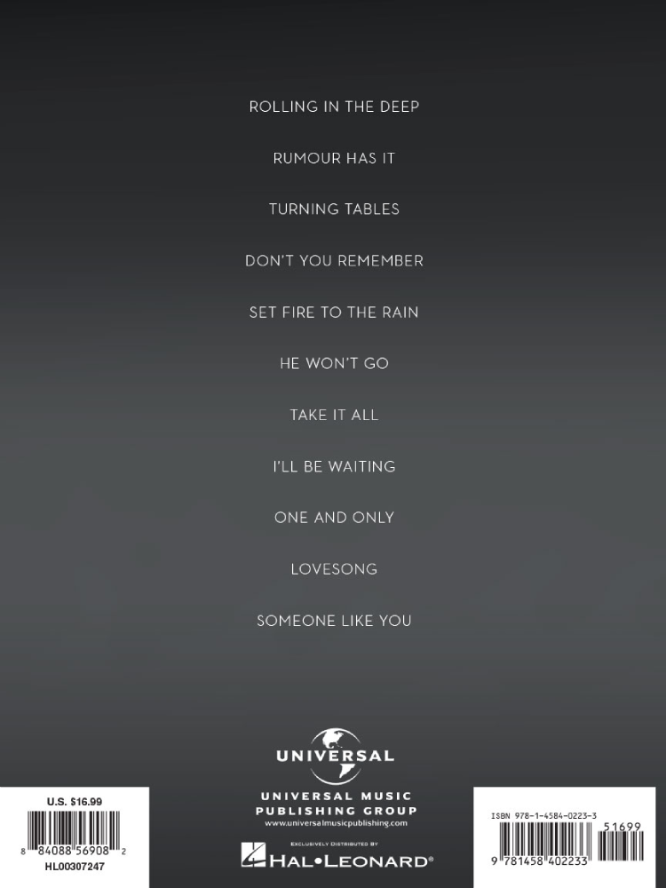 Adele's sophomore CD 21 has enjoyed enormous critical acclaim, with reviewers lauding this British, multi-Grammy-winner's vocal performance and introspective songwriting. The Hal Leonard songbook matches the CD, with piano/vocal/guitar arrangements of the smash hits “Rolling in the Deep” and “Someone like You,” plus: Don't You Remember • He Won't Go • I'll Be Waiting • Lovesong • One and Only • Rumour Has It • Set Fire to the Rain • Take It All • Turning Tables.