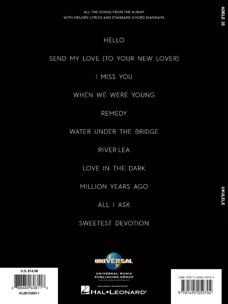 All 11 songs from the Adele's triumphant return to the charts with this 2015 album. Our songbook features ukulele arrangements with chord frames for: All I Ask • Hello • I Miss You • Million Years Ago • Remedy • Sweetest Devotion • When We Were Young • and more.