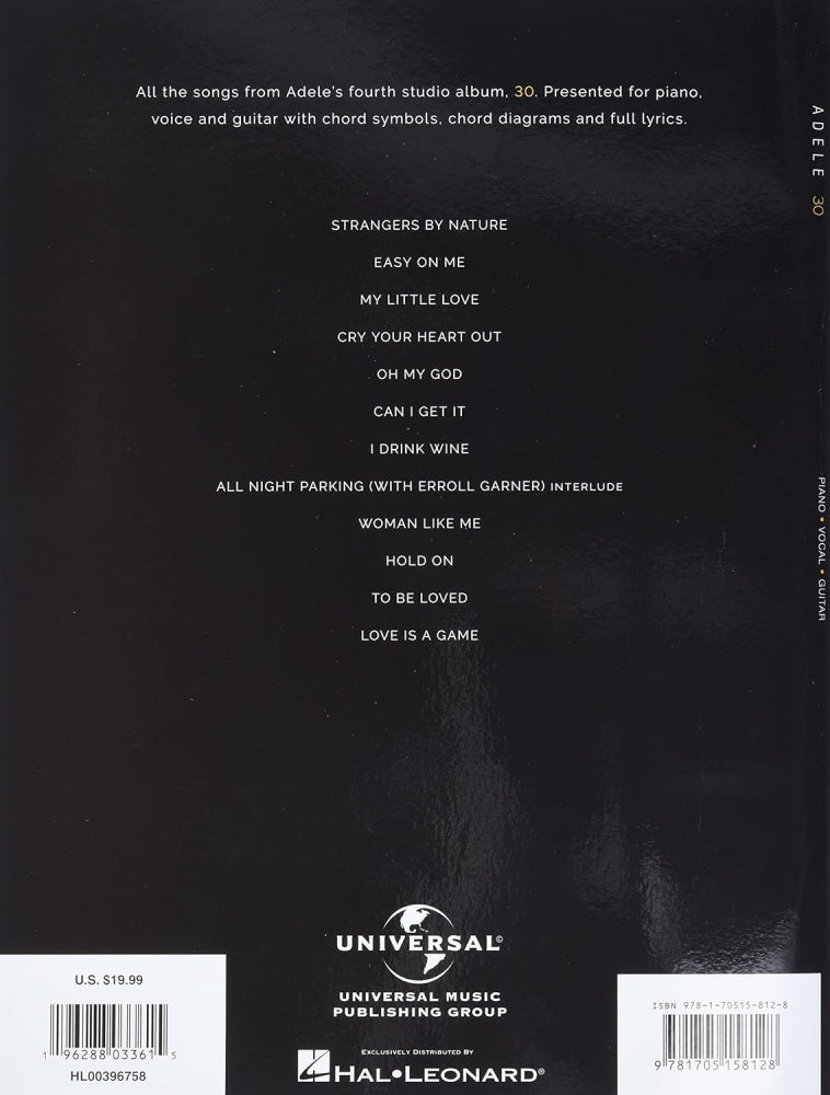 Our matching folio to Adele's long-awaited fourth album features all the tracks arranged for piano/vocal/guitar including: All Night Parking (Interlude) • Can I Get It • Can't Be Together • Cry Your Heart Out • Easy on Me • Hold On • I Drink Wine • Love Is a Game • My Little Love • Oh My God • Strangers by Nature • To Be Loved • Wild Wild West • Woman like Me.