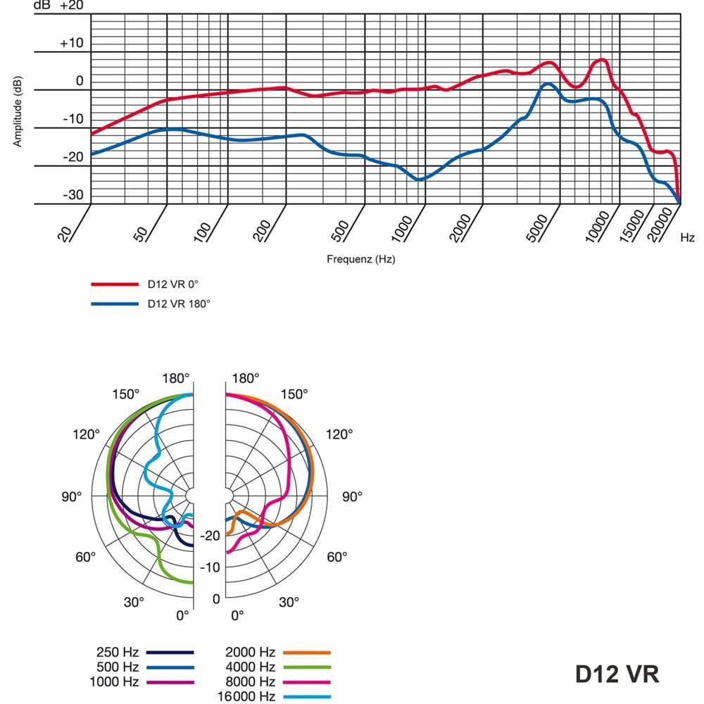 The D12 VR is a large-diaphragm dynamic microphone designed for kick-drum recording, featuring a cardioid polar pattern. Its thin diaphragm enhances low-frequency performance, delivering a warm sound through the original C414 transformer, particularly effective at high signal levels. With three active filter presets to match kick drum character, the output level is automatically reduced by 10 dB when activated. The filter settings are adjustable via a switch on the microphone, and without phantom power, it operates in passive mode, delivering the instrument's pure sound.