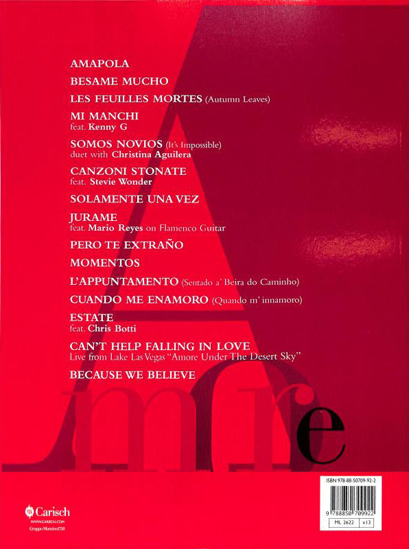While creating the perfect track listing for Bocelli's first-ever album of popular songs, Bocelli and his producers searched the musical eras from the 1920s to the 1980s for songs in Italian, Spanish and French. Bocelli also added some of his favorite international pop songs, including the Italian classics “L'Appuntamento” and “Quando M'Innamoro,” the Latin American hit “Besame Mucho,” and the French standard “Les Feuilles Mortes,” which has become the much-loved English standard “Autumn Leaves.” “Solamente Una Vez” (a hit as “You Belong to My Heart” for stars including Elvis Presley and Bing Crosby) and “Somos Novios” (famously an English-language hit as “It's Impossible” for Perry Como) are also highlights of the album. The end result is Bocelli's amazingly beautiful interpretation of classics made popular by legendary vocalists from Edith Piaf and Luis Miguel to Elvis Presley and Frank Sinatra. This folio includes all 14 tracks arranged for piano and voice with guitar chord frames.