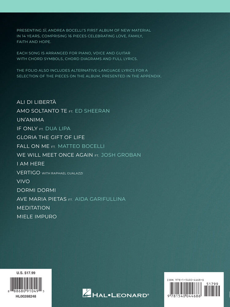 Si is Andrea Bocelli's first album of new material in 14 years, comprising 16 pieces celebrating love, family, faith and hope. Each song is arranged for piano, voice and guitar with chord symbols, chord diagrams and full lyrics. Alternative language lyrics for a selection of the pieces on the album is also presented in the appendix. Songs include: Ali di Liberta • Amo soltanto te • Ave Maria Pietas • Dormi Dormi • Fall on Me • Gloria the Gift of Life • I Am Here • If Only • Meditation • Miele Impuro • Un'anima • Vertigo • Vivo • We Will Meet Once Again.