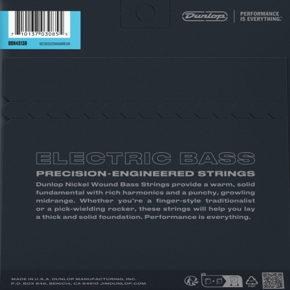 Get thundering lows and a fat warm tone with Dunlop DBN45130 nickel-wound bass strings. Dunlop bass strings are used by professionals the world over. Theyre perfect for traditionalists, pick players, slappers, and anyone who wants a fat bass tone with growling midrange, rich harmonics, and a solid fundamental. The Dunlop DBN45130 bass strings use a carefully selected core-to-wrap ratio for comfortable low tension, and minimal break-in, and extremely long life.Product Features: