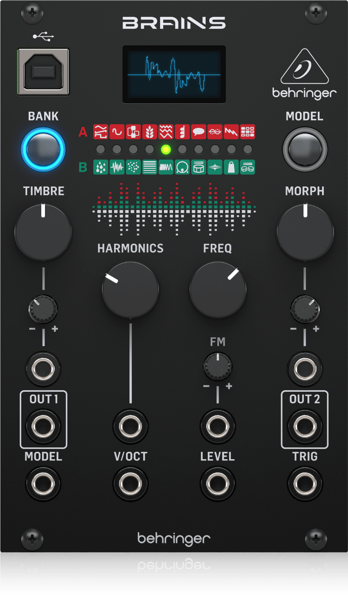 High-Resolution Multi-Engine Oscillator Module for Eurorack with 20 Synthesis Engines, 96 kHz Sound Quality and OLED Oscilloscope. The Behringer BRAINS is an amazingly versatile digital sound source for creating percussion sounds, leads and basses, as well as drones and soundscapes. With 20 digital oscillator modes, including many different control engines, youve got a wealth of different sounds and timbres to create some wild and out-of-this-world patches.