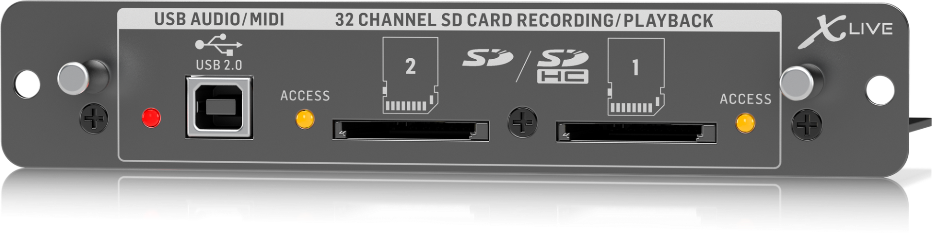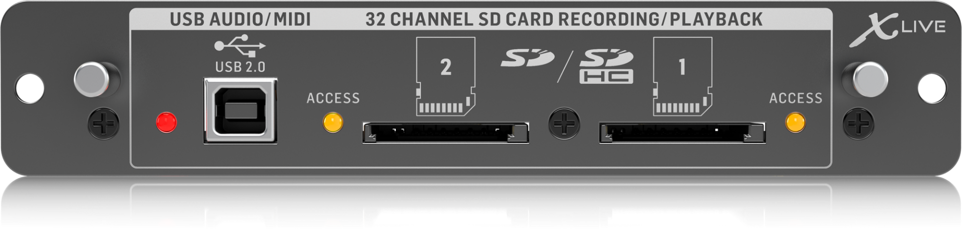 The X-LIVE interface card expands on the already stellar performance of the X-USB card that has been standard in X32 consoles for years. The same 32-channel bi-directional audio I/O via USB 2.0 is available, providing 32 channels for recording and playback, plus remote operation of your DAW via HUI/Mackie Control emulation. The addition of dual SD/SDHC slots provides fully independent recording and playback of up to 32 channels of uncompressed WAV files in consistent sessions.