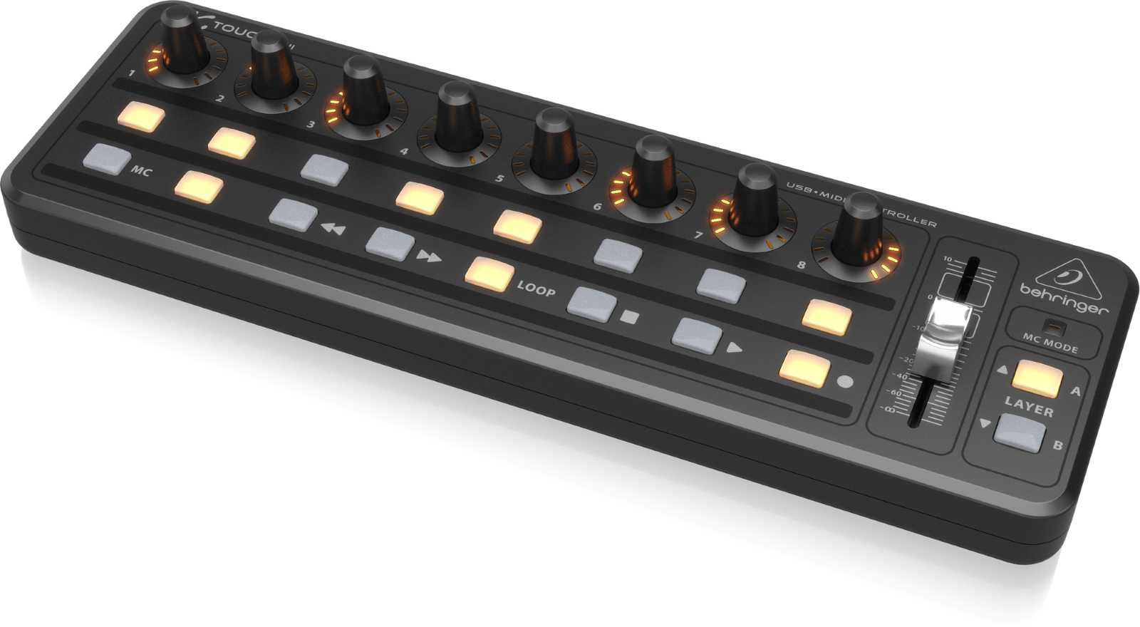 - 8 rotary controls with LED-collars for on-the-fly adjustments of your favorite parameters