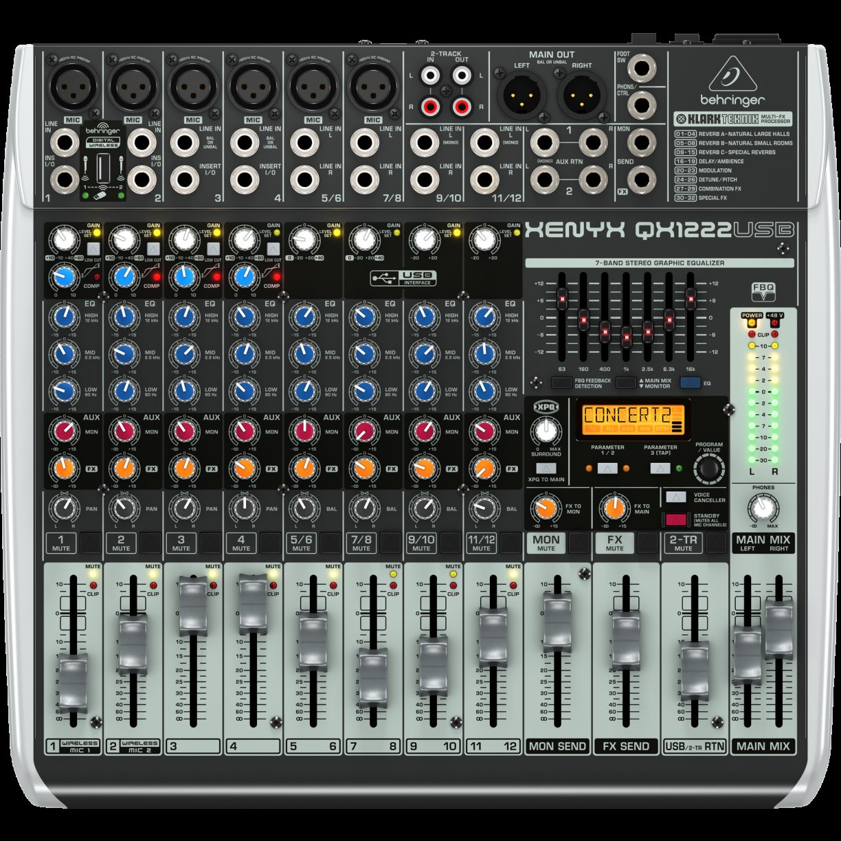 The XENYX QX1222USB mixer delivers premium sound effortlessly with XENYX Mic Preamps on channels 1-4 and versatile stereo channels. Featuring "British" 3-band EQs and intuitive "one-knob" compressors on mono channels, it ensures punch and clarity. The KLARK TEKNIK FX processor with 32 studio-grade presets adds versatility, making the QX1222USB ideal for live performances. With dual-addressable parameters, Tap function, and user parameter settings, this compact mixer offers a complete solution for achieving high-quality sound in a variety of settings.