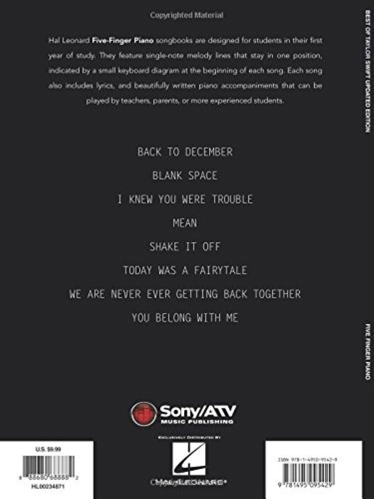 (Five Finger Piano Artist Songbook). 8 single-note melody lines with lyrics and accompaniments of hits from country/pop superstar Taylor Swift. This updated edition includes the songs: Back to December * Blank Space * I Knew You Were Trouble * Mean * Shake It Off * Today Was a Fairytale * We Are Never Ever Getting Back Together * You Belong with Me. Hal Leonard five-finger piano songbooks are designed for students in their first year of study. They feature single-note melody lines that stay in one position, indicated by a small keyboard diagram at the beginning of each song. Each song also includes beautifully-written piano accompaniments that can be played by teachers, parents, or more advanced students to enhance the five-finger player's experience.