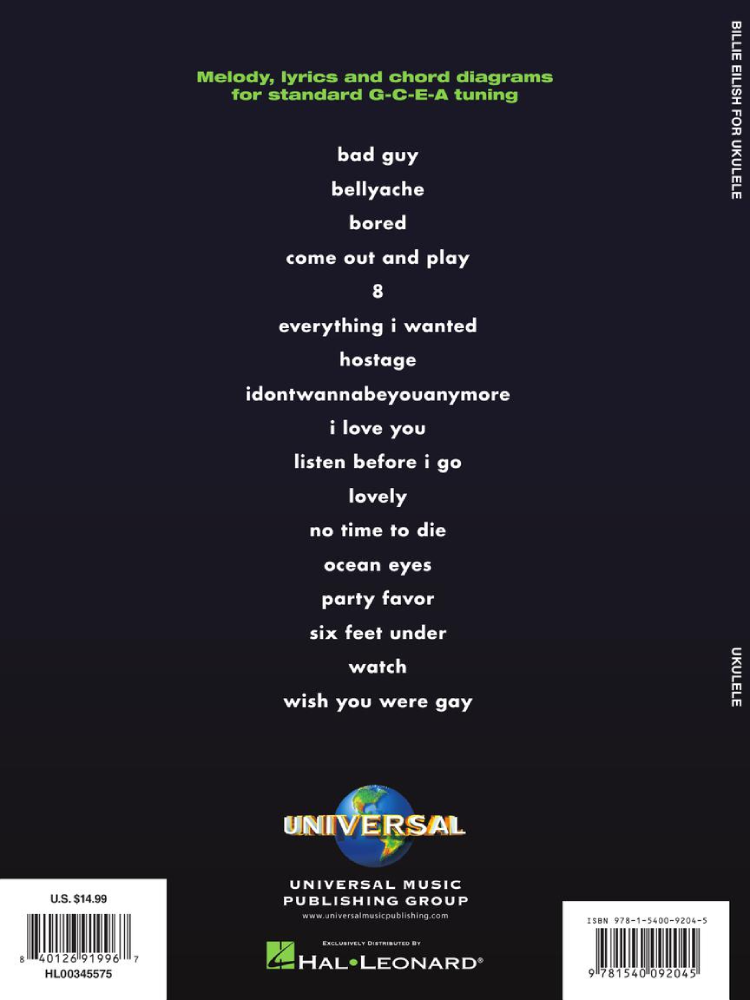 Melody, lyrics and chord diagrams for 17 Eilish songs in standard G-C-E-A tuning for ukulele: Bad Guy • 8 • Everything I Wanted • Lovely • No Time to Die • Ocean Eyes • Party Favor • Wish You Were Gay • and more.