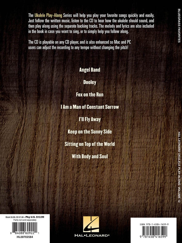The Ukulele Play-Along series will help you play your favorite songs quickly and easily, with incredible backing tracks to help you sound like abona fide pro! Just follow the written music, listen to the CD to hear how the ukulele should sound, and then play along with the separate backing tracks. The melody and lyrics are included in the book in case you want to sing, or to simply help you follow along. The CD is playable on any CD player, and also enhanced so Mac & PC users can adjust the recording to any tempo without changing the pitch! This volume includes 8 bluegrass classics: Angel Band · Dooley · Fox on the Run · I Am a Man of Constant Sorrow · I'll Fly Away · Keep on the Sunny Side · Sitting on Top ofthe World · With Body and Soul.