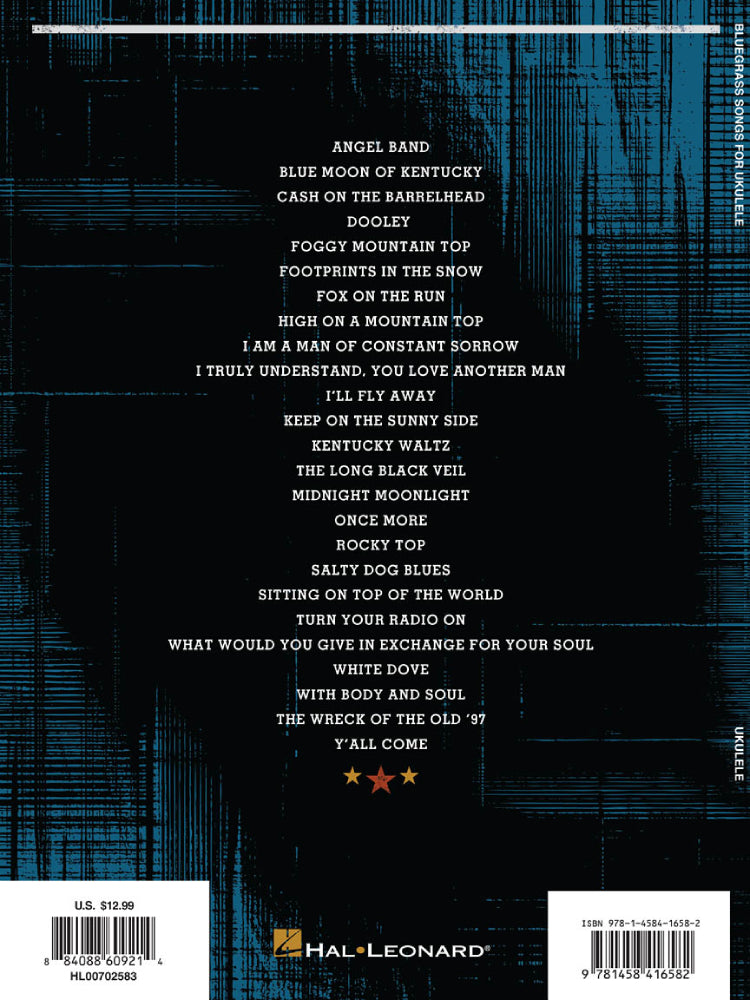 25 bluegrass favorites to jam with on your uke, including: Blue Moon of Kentucky • Dooley • Foggy Mountain Top • Fox on the Run • High on a Mountain Top • I Am a Man of Constant Sorrow • I'll Fly Away • Keep on the Sunny Side • Kentucky Waltz • The Long Black Veil • Rocky Top • Sitting on Top of the World • Turn Your Radio On • The Wreck of the Old '97 • and more.