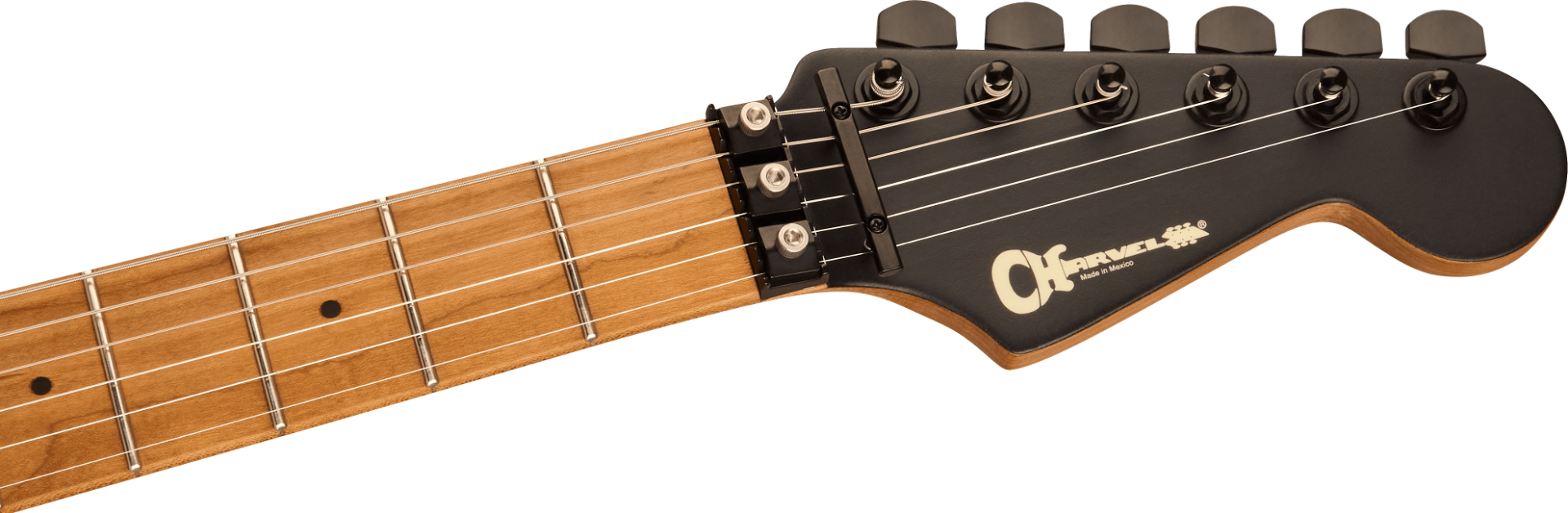Take your shredding to the next level with the all–new Pro–Mod Plus So–Cal from Charvel. This modernized take on the classic So–Cal shred machine packs even more cutting–edge features for lightning–fast playing. The super–stable caramelized bolt–on maple neck with graphite reinforcement rods offers rock–solid stability regardless of temperature or environment. The 12″–16″ compound radius caramelized maple fingerboard has smoothly rolled edges and 4mm black dot inlays for effortless riffing.