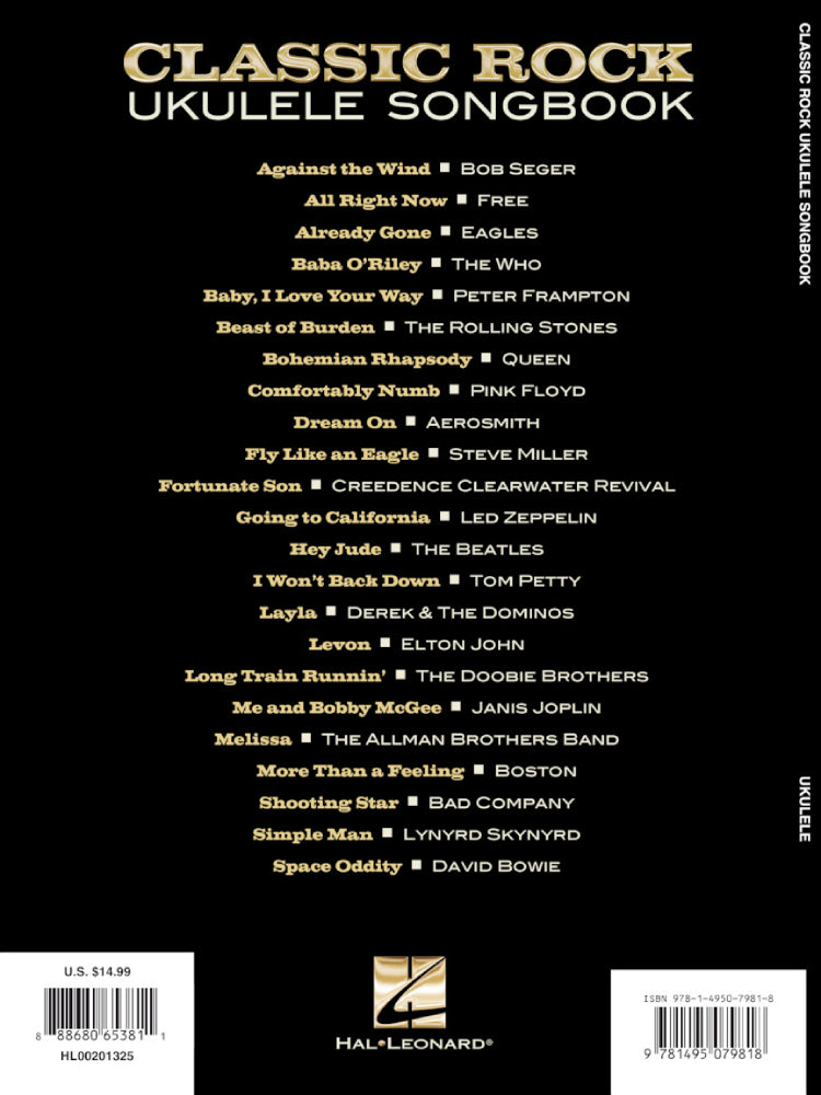 This awesome collection features 23 classic rock hits transcribed for ukulele, including: All Right Now • Baba O'Riley • Beast of Burden • Bohemian Rhapsody • Dream On • Fly like an Eagle • Fortunate Son • Hey Jude • Layla • Me and Bobby McGee • More Than a Feeling • Simple Man • Space Oddity • and many more.