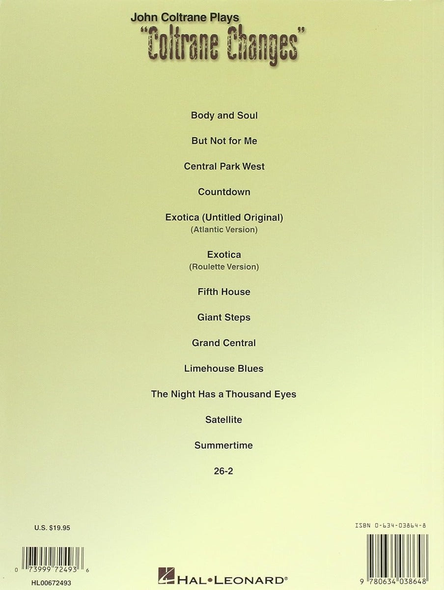 (Artist Transcriptions). In the late 1950s, John Coltrane composed or arranged a series of tunes that used chord progressions based on a series of key center movements by thirds, rather than the usual fourths and fifths of standard progressions. This sound is so aurally identifiable and has received so much attention from jazz musicians that it has become known as "Coltrane's Changes." This book presents an exploration of his changes by studying 13 of his arrangements, each containing Coltrane's unique harmonic formula. It includes complete solo transcriptions with extensive performance notes for each. Titles include: Body and Soul * But Not for Me * Central Park West * Countdown * Fifth House * Giant Steps * Summertime * and more.