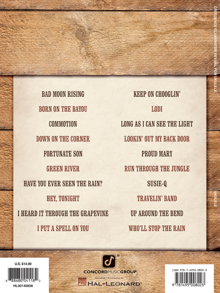 20 CCR favorites to strum on your uke, including: Bad Moon Rising •Born on the Bayou • Down on the Corner • Fortunate Son • Green River • Have You Ever Seen the Rain? • Lookin' Out My B ack Door • Proud Mary • Susie-Q • Travelin' Band • Up Around the Bend • Who'll Stop the Rain • and more.