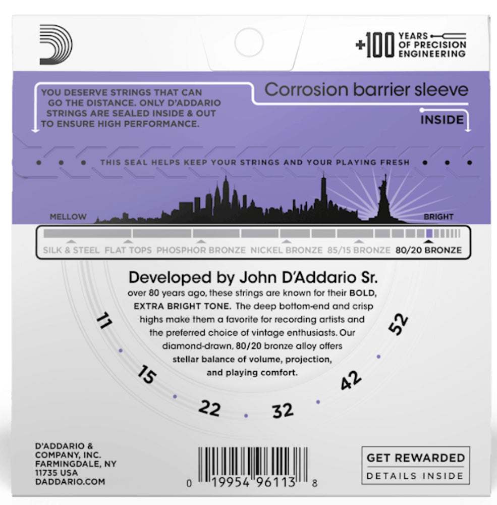 D'Addario 80/20 Bronze Acoustic Guitar Strings 11-52 Custom Light Gauge
