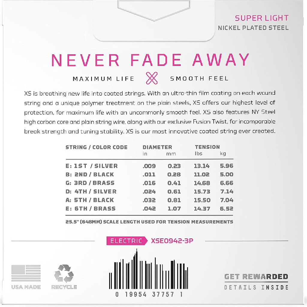 D'Addario XS Super Light Coated Electric Guitar Strings 3 Pack 09-42 Gauge