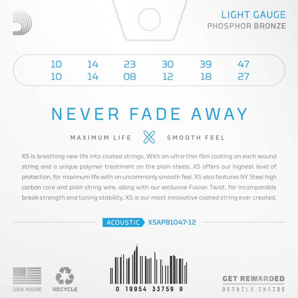 DAddario XS Coated 12 String Phosphor Bronze Acoustic Guitar Strings 10-47 Light Gauge