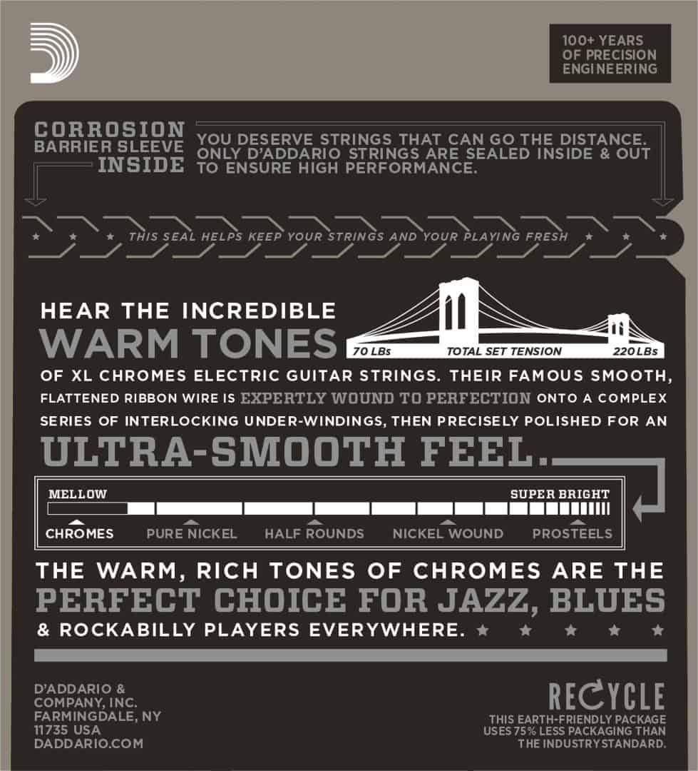 D'Addario Chromes are wound with flattened stainless steel ribbon wire which is polished to an incredibly smooth surface. Chromes deliver a distinctive damped but tone-rich sound that only flatwounds can produce. D'Addario Chromes are the world's most popular flatwound strings. Number Of Strings: 6Product Features: