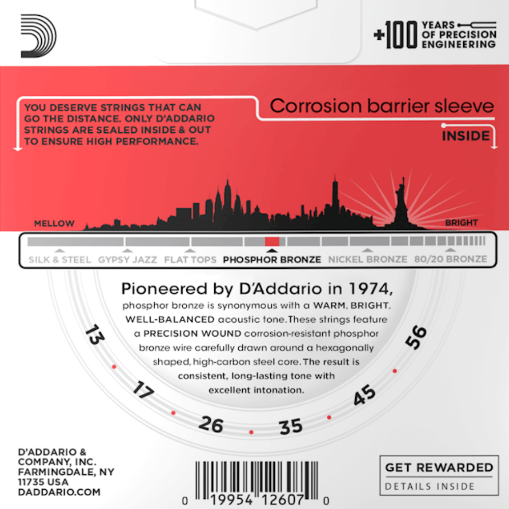 Phosphor Bronze was introduced to string making by D'Addario in 1974 and has become synonymous with warm, bright, and well balanced acoustic tone. D'Addario Phosphor Bronze strings are precision wound with corrosion resistant phosphor bronze onto a carefully drawn, hexagonally shaped, high carbon steel core. The result is long lasting, bright sounding tone with excellent intonation. Number Of Strings: 6Product Features:
