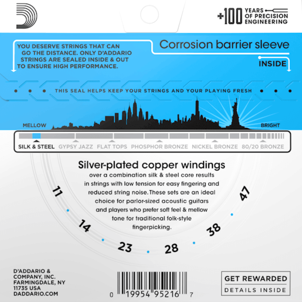 Silk and Steel were uniquely designed to be our warmest, mellowest acoustic guitar string. Ideal for parlor guitars and vintage instruments, the softened tone of Silk & Steel is often preferred by folk players. Made with silver-plated copper windings, over a combination silk and steel core. This 11-47 Light set is easy to play and provides a warm tone. Number Of Strings: 6Product Features: