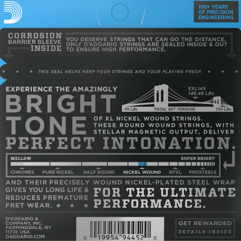 XL Nickel Wound, D'Addario's most popular electric guitar strings, are precision wound with nickelplated steel onto a carefully drawn, hexagonally shaped, high carbon steel core. The result, strings with long lasting, distinctive bright tone and excellent intonation, is ideal for the widest variety of guitars and musical styles. Number Of Strings: 6Product Features: