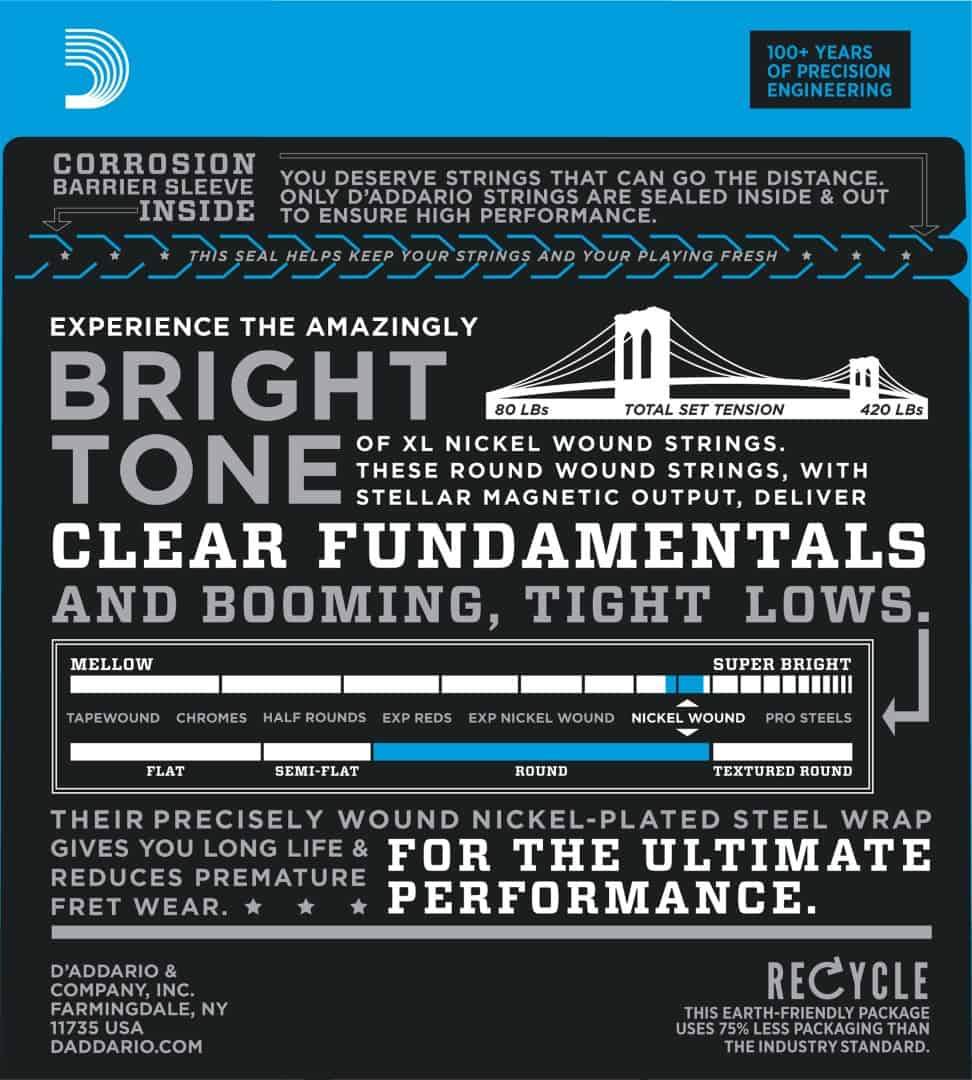 - Round wound with nickelplated steel for a distinctive bright tone with clear fundamentals and booming, tight low end