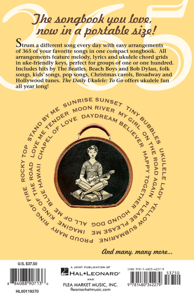 Compiled and arranged by Liz and Jim Beloff, The Daily Ukulele: To Go features 365 well-known songs with easy ukulele arrangements in one 5-1/2 x 8-1/2 compact songbook. Featuring the same songs and arrangements from the original full-size Daily Ukulele, this streamlined edition is smaller, lighter and perfect for those who want to travel with their favorite songbook. All arrangements feature melody, lyrics and ukulele chord grids in uke-friendly keys and never require a page turn in the middle of a song. Includes hits by the Beatles, Beach Boys and Bob Dylan, folk songs, kids' songs, pop songs, Christmas carols, and Broadway and Hollywood tunes. A comb binding allows for easy “fold-flat” usage. The Daily Ukulele: To Go offers ukulele fun all year long!