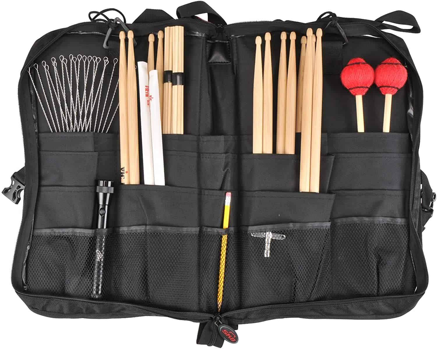 The 1SKB-SB300 is an upgraded stick/mallet bag that has (4) multi-layered pockets that provide ample storage of sticks, mallets and brushes. The interior also has (4) mesh pockets for drum keys or other small parts. The outside zipper pocket is large enough for an iPad, metronome or small practice pad. An adjustable shoulder strap and straps for mounting on a drum or mallet instrument are included.