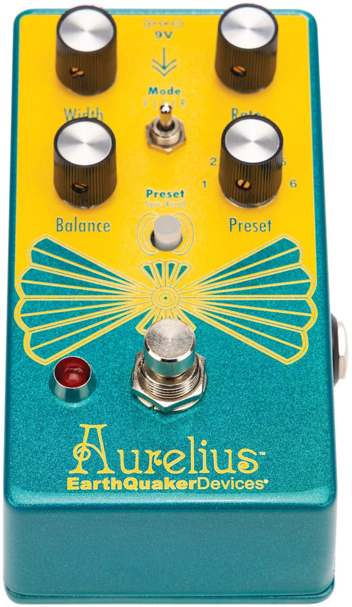 The Aurelius tri-voice chorus pairs EarthQuaker Device’s savvy circuitry skills with a stunning array of classic and modern chorus tones. And it’s matched with a user-friendly preset system for easy recall of your favorite tones! Aurelius is a meticulously refined digital unit based on one of the most influential vintage choruses ever produced, but it’s hardly a 1-to-1 copy. Aurelius’ three modes and vibrant expression pedal options allow everything from subtle, classic chorus to exaggerated and enhanced tones ranging from sea-sick warble and true vibrato to feedback-laden flangers and dual-modulation rotary tones. In true EarthQuaker fashion, the Aurelius gives true bang for your buck and does a lot without requiring a Ph.D. in manual studies. Give your modulation mindset a fresh jump-start with the powerful EarthQuaker Aurelius chorus!