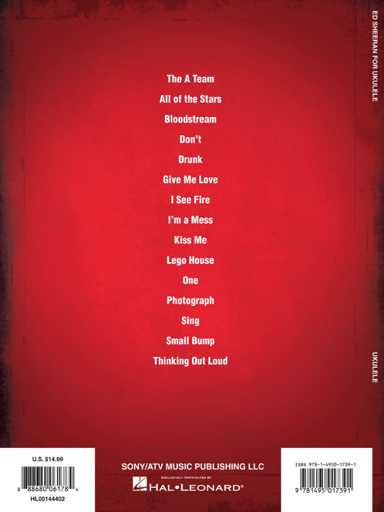 15 of the hottest hits by this British singer/songwriter in arrangements you can strum & sing on the uke, including: The A Team • Don't • Lego House • Sing • Thinking Out Loud • and more.