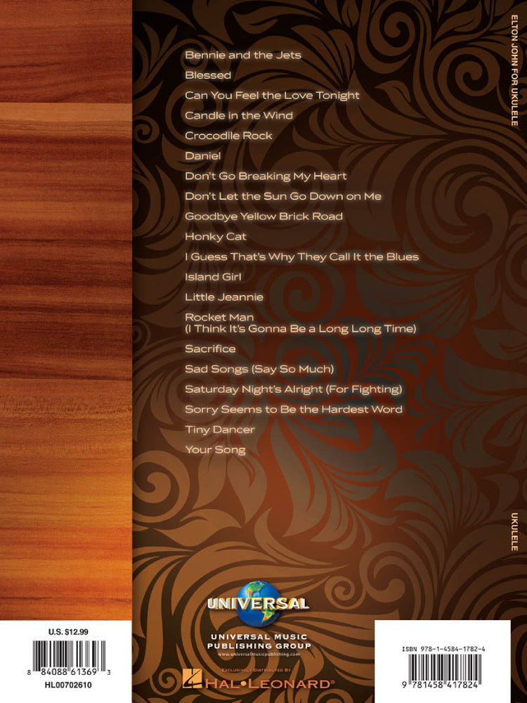20 Elton favorites arranged for uke, including: Bennie and the Jets • Can You Feel the Love Tonight • Candle in the Wind • Crocodile Rock • Daniel • Don't Go Breaking My Heart • Goodbye Yellow Brick Road • I Guess That's Why They Call It the Blues • Rocket Man (I Think It's Gonna Be a Long Long Time) • Sad Songs (Say So Much) • Saturday Night's Alright (For Fighting) • Your Song • and more.
