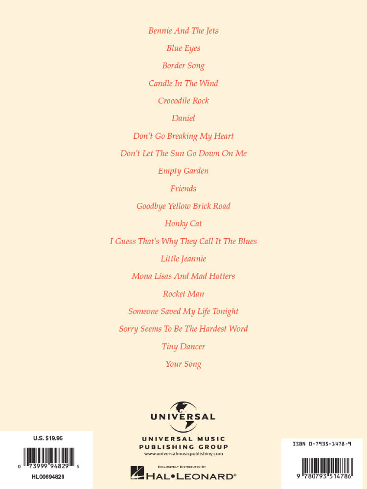 This terrific collection features 20 of Elton John's best songs: Bennie and the Jets • Candle in the Wind • Crocodile Rock • Daniel • Don't Go Breaking My Heart • Goodbye Yellow Brick Road • Honky Cat • Rocket Man • Tiny Dancer • and more.
