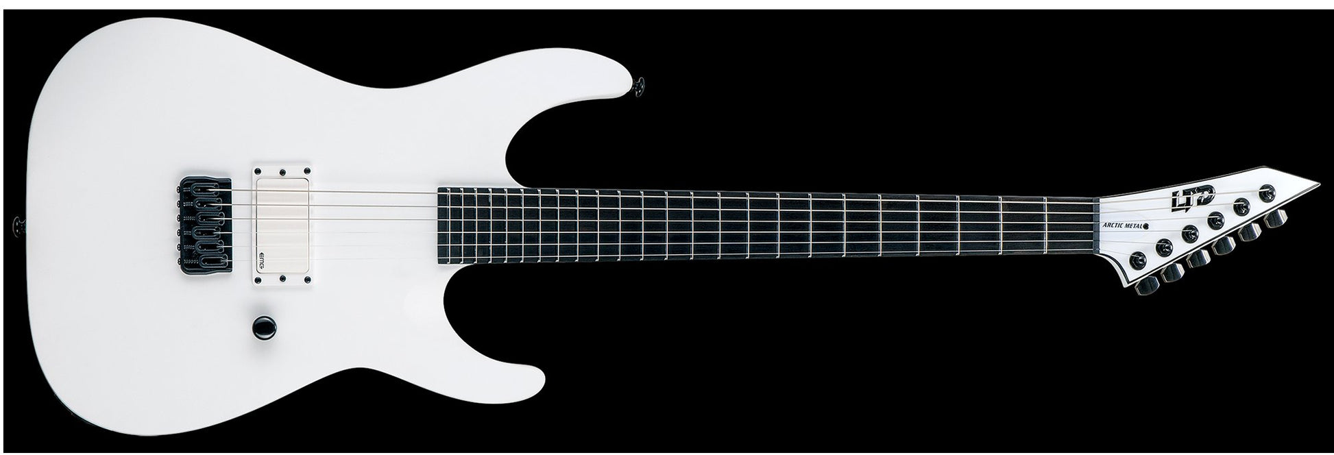 The LTD Arctic Metal Series takes the same design theme of our Black Metal Series and flips the color scheme from the darkest of blacks to the coldest of frozen wastelands. Comparable in build quality to our LTD Deluxe 1000 Series, Arctic Metal instruments feature a Snow White Satin finish, a single premium-quality pickup with matching white cover, and Macassar ebony fingerboards with no inlays and glow-in-the-dark side markers.