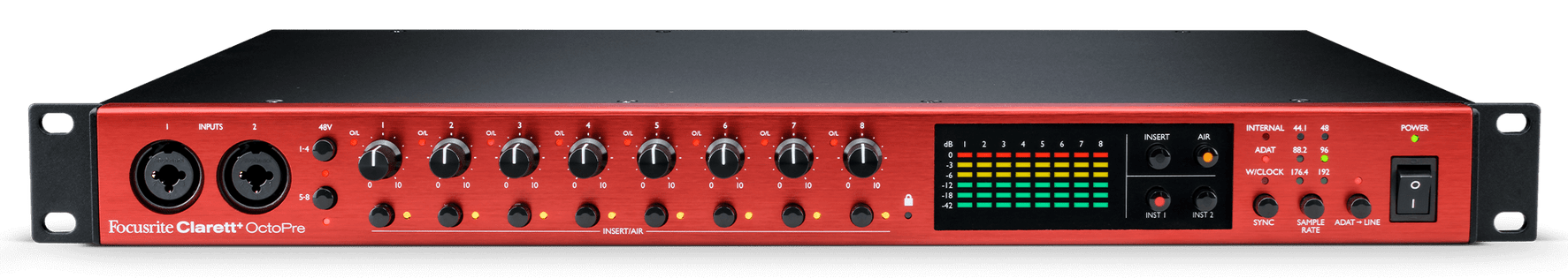 The Clarett+ OctoPre is the eight-channel ADAT preamp designed to bring pure analogue sound to your studio. The eight Clarett preamps have been meticulously engineered to bring authentic large-format studio sound to any ADAT enabled interface. All-analogue Air mode, with impedance switching, recreates the legendary effect of Focusrite's ISA mic pres, adding clarity and presence to drums, guitars and vocals.
