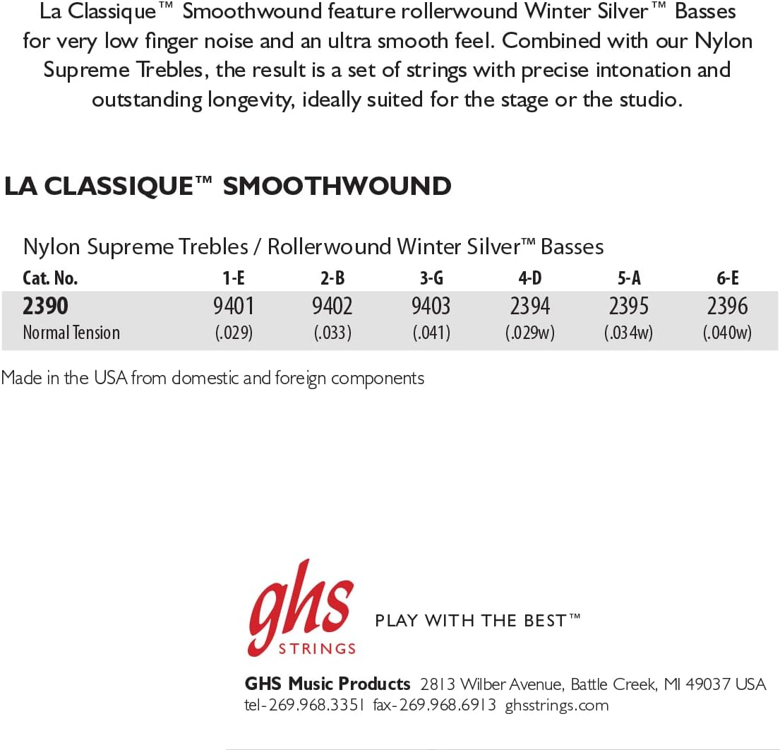 La Classique Smoothwound feature our Nylon Supreme Trebles with Rollerwound Winter Silver Basses. The smoothwound basses provide very low finger noise and makes this a great string set for recording purposes. This set is Medium High Tension. GHS Strings are manufactured in a state-of-the-art, climate controlled facility using precision equipment and only the purest of materials.Product Features: