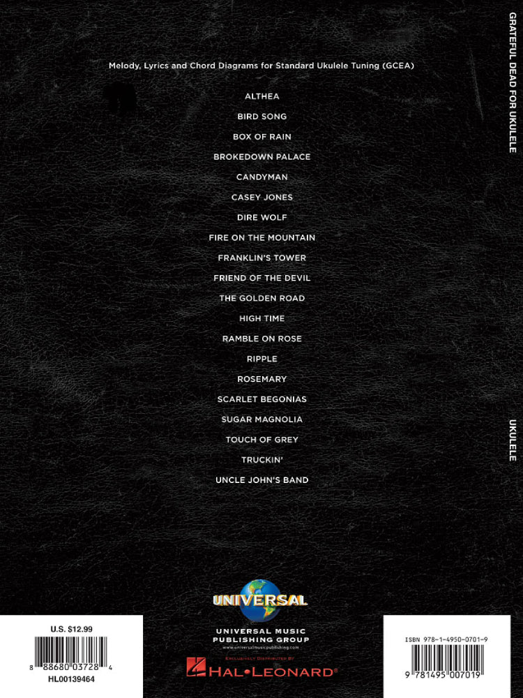 Now Dead Heads can strum along to 20 of their favorites on the ukulele! This collection brings together the melody, lyrics and chord diagrams in standard GCEA ukulele tuning for the songs: Box of Rain • Brokedown Palace • Casey Jones • Friend of the Devil • The Golden Road • Ripple • Sugar Magnolia • Touch of Grey • Truckin' • Uncle John's Band • and more.
