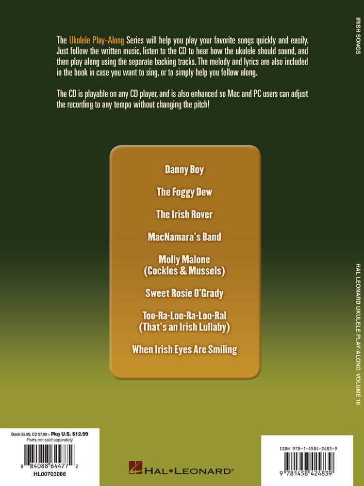 The Ukulele Play-Along series will help you play your favorite songs quickly and easily, with incredible backing tracks to help you sound like abona fide pro! Just follow the written music, listen to the CD to hear how the ukulele should sound, and then play along with the separate backing tracks. The melody and lyrics are included in the book in case you want to sing, or to simply help you follow along. The CD is playable on any CD player, and also enhanced so Mac & PC users can adjust the recording to any tempo without changing the pitch! Each Ukulele Play-Along packfeatures eight quintessential songs.Songs include: Danny Boy, The Fogg y Dew, The Irish Rover, MacNamara's Band, Molly Malone (Cockles & Mussels), Sweet Rosie O'Grady, Too-Ra-Loo-Ra-Loo-Ral (That's an Irish Lullaby), When Irish Eyes Are Smiling.