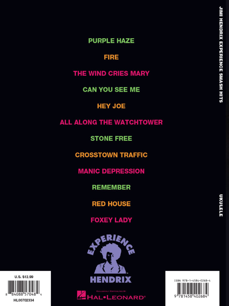 Be the coolest uke player on the block with this book featuring a dozen of Hendrix's best! Contains ukulele arrangements of: All Along the Watchtower • Can You See Me • Crosstown Traffic • Fire • Foxey Lady • Hey Joe • Manic Depression • Purple Haze • Red House • Remember • Stone Free • The Wind Cries Mary.
