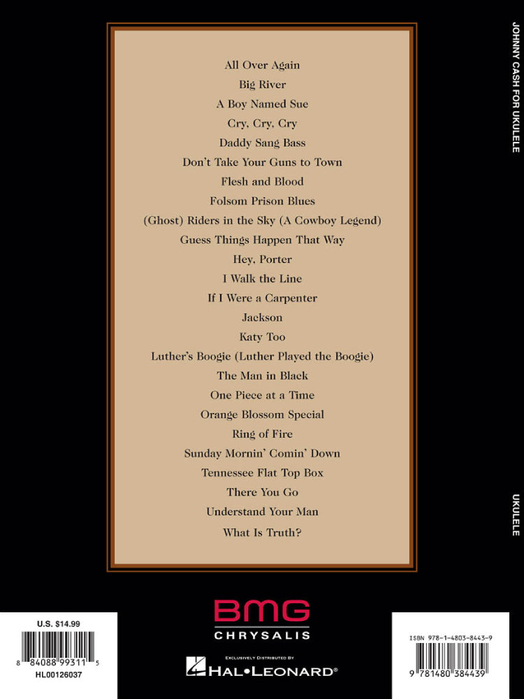 25 songs from the Man in Black are featured in this collection for the uke, including: All over Again • A Boy Named Sue • Cry, Cry, Cry • Don't Take Your Guns to Town • Folsom Prison Blues • I Walk the Line • Jackson • The Man in Black • Orange Blossom Special • (Ghost) Riders in the Sky (A Cowboy Legend) • Ring of Fire • Tennessee Flat Top Box • Understand Your Man • and more.