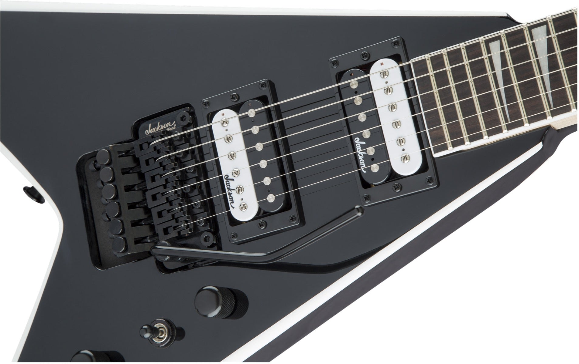 he JS Series King V JS32 offers one of our most regal shapes and outstanding performers with an affordable price tag. This formidable King V has a poplar body, bolt-on maple speed neck with graphite reinforcement and scarf joint for rock-solid stability. Its 12"-16" compound radius bound amaranth fingerboard features 24 jumbo frets and pearloid sharkfin inlays. Other features include dual Jackson high-output humbucking pickups with ceramic magnets and three-way toggle switching, Jackson-branded Floyd Rose® double-locking tremolo bridge, standard strap buttons and sealed die-cast tuners.Product Features: