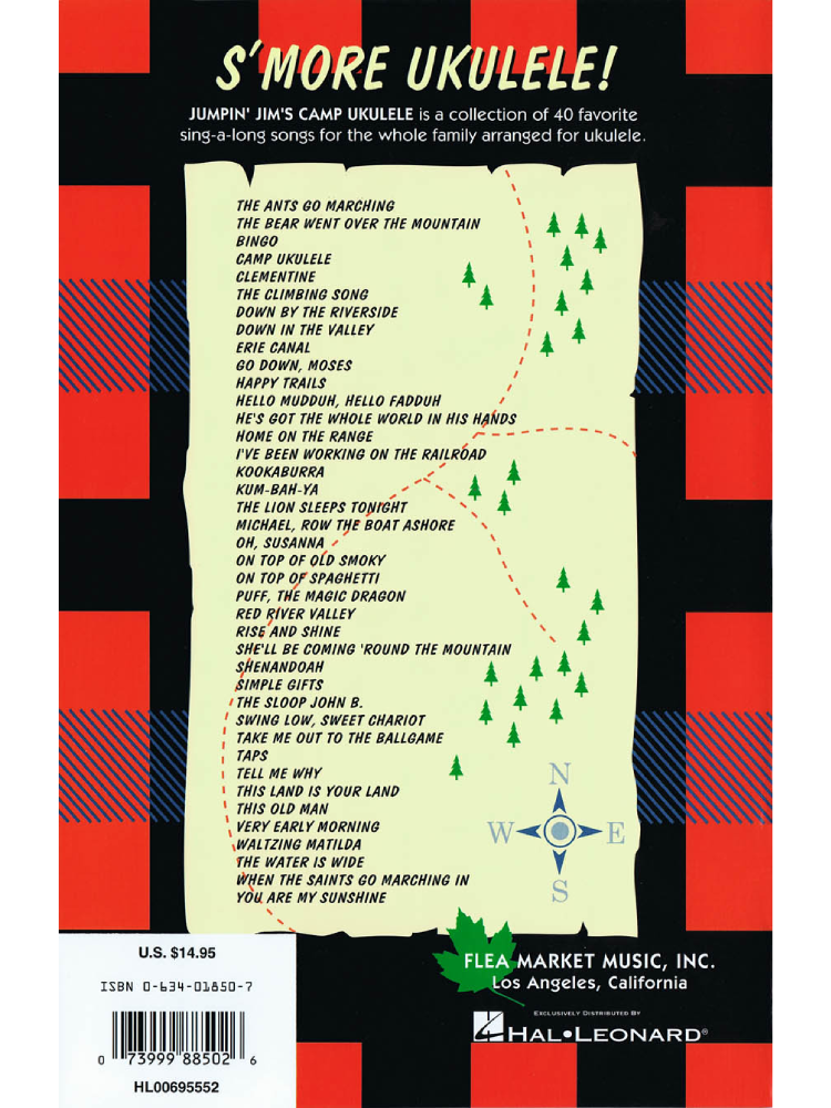 Here's ukulele fun for the whole family! Jumpin' Jim's Camp Ukulele is acollection of 40 of some of the best-loved family sing-along songs with easy-to-play ukulele arrangements. Tunes include: Clementine · Go Down, Moses · Happy Trails · Home on the Range · The Lion Sleeps Tonight · Th e Sloop John B. · Take Me Out to the Ballgame · This Land Is Your Land ·Waltzing Matilda · You Are My Sunshine · and many others. This songbook features many vintage summer fun photographs, a chord chart, and a basi c how-to-play section.