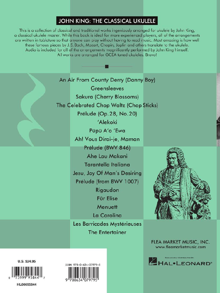 John King - The Classical Ukulele is a collection of 19 classical and traditional works ingeniously arranged for ukulele by John King. While this book is ideal for more experienced players, all of the arrangements are written in tablature so that anyone can play without having to read music. Most amazing is how well these famous pieces by J. S. Bach, Mozart,Chopin, Joplin and others translate to the ukulele. Works include Jesu, Joy Of Man's Desiring, Für Elise, Chop Sticks, Greensleeves, Danny Boy and The Entertainer. Also included is a CD of all of the arrangements m agnificently performed by John King himself. All works are arranged for GCEA tuned ukuleles.