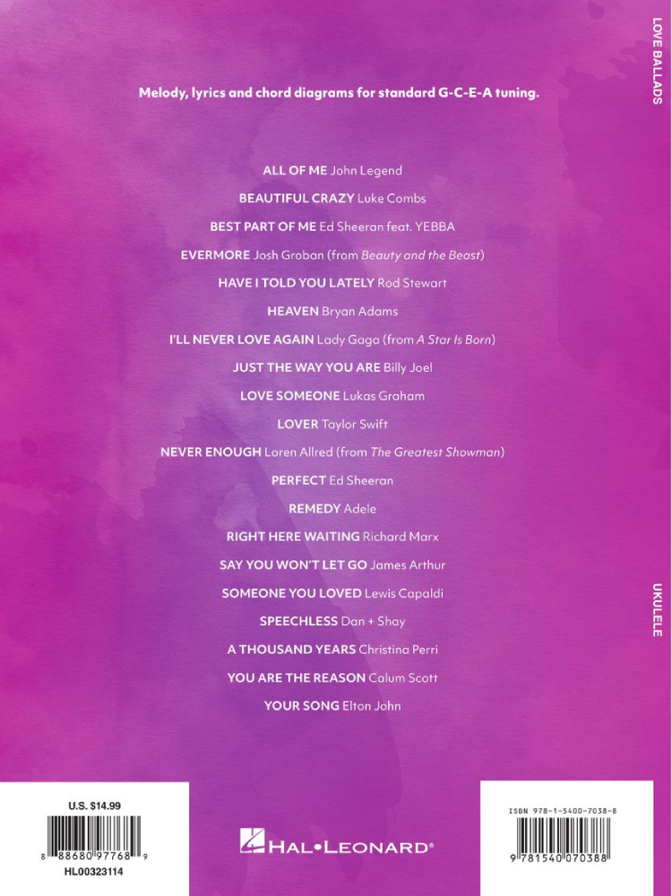 20 romantic favorites presented with melody, lyrics and chord diagrams for standard G-C-E-A tuning. Songs include: All of Me • Beautiful Crazy • Evermore • Have I Told You Lately • Just the Way You Are • Lover • Perfect • Right Here Waiting • Someone You Loved • A Thousand Years • You Are the Reason • and more.